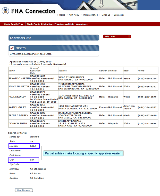 If you know all or part of the appraiser's identifier, you may quickly locate a specific appraiser by entering all or part of the License [ID number]. The first two letters of the appraiser ID correspond to the state in which the appraiser is licensed. Entering a partial ID number may avoid a typographical error or incorrect number format that results in incorrect or no information found. If a partial ID number is entered, you can further streamline the search by entering the City or Zip Code where the appraiser is located. |
